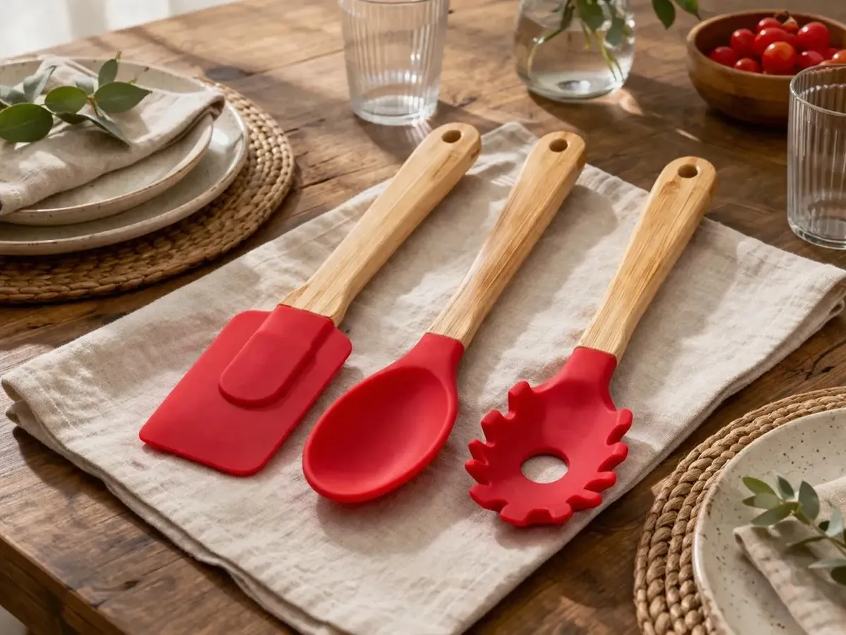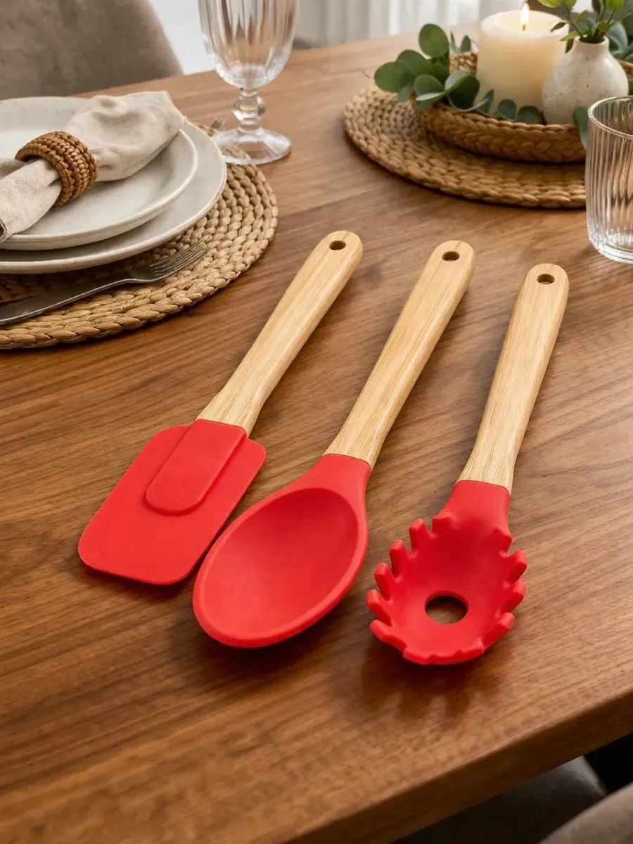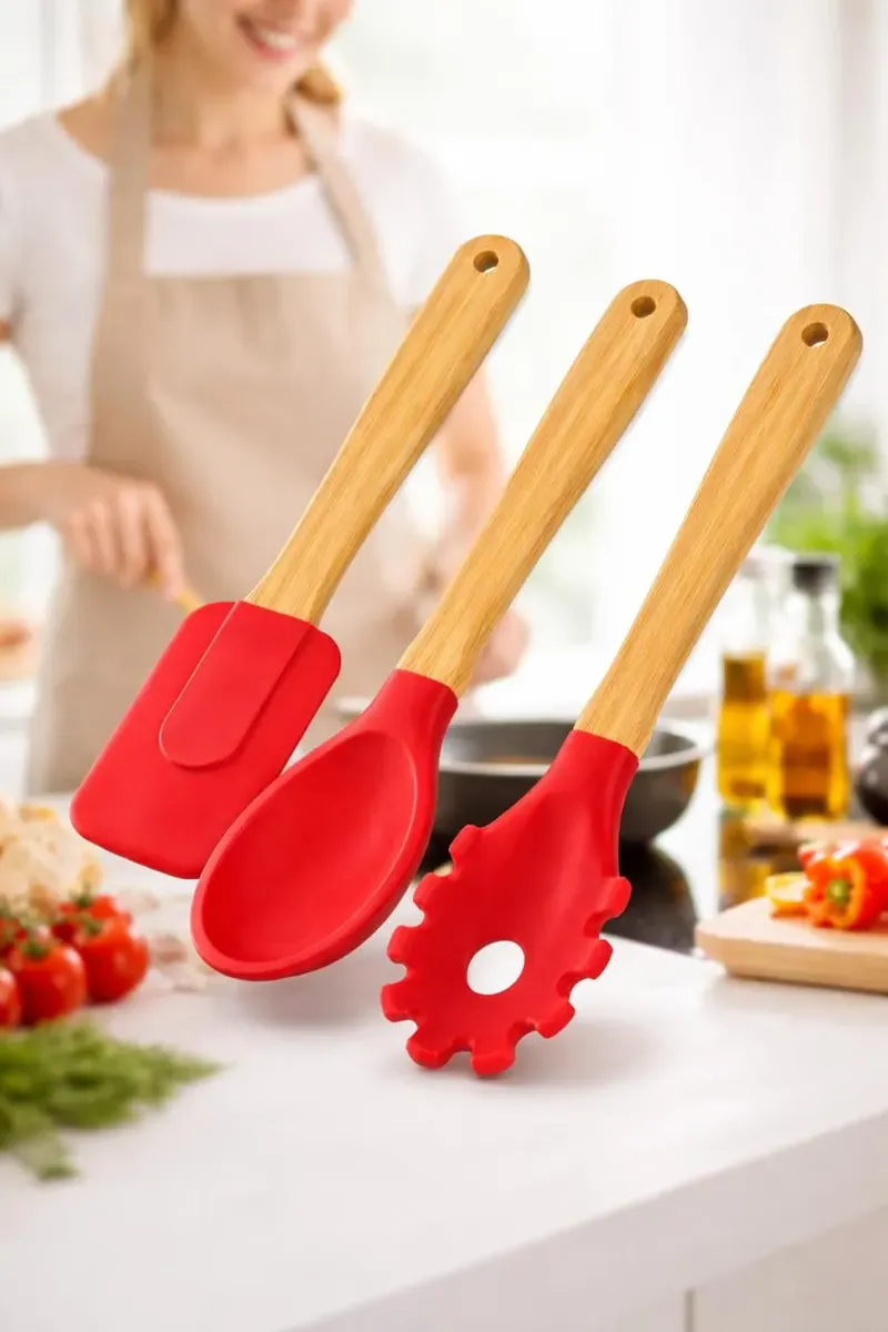 Kit C/3 Utensilios De Silicone E Bamboo Vermelho